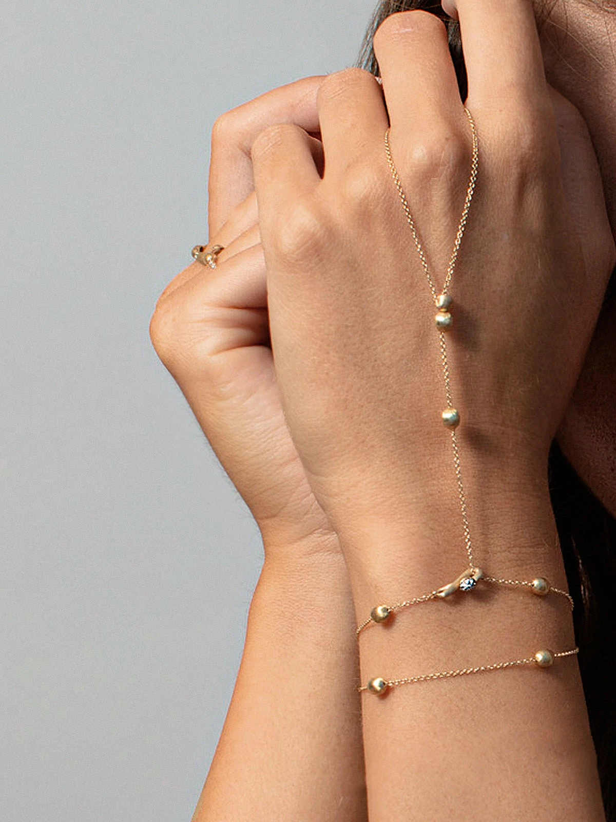 Free, light and always ready to change: it is SOFFIO GITANO, a jewel that blends artisan tradition with the dynamism of the modern woman. The charm of change is in fact the true inspiration of this creation in 18kt gold and diamonds. Laura, our designer, conceived it as a ring and bracelet at the same time, made unique by the iconic diamond clasp that adorns the hand with incredible refinement. The same closure that allows you to open the jewel and transform it into a beautiful necklace characterized by hand-engraved gold boules. A masterpiece of versatility and creativity, capable of following you in every adventure.