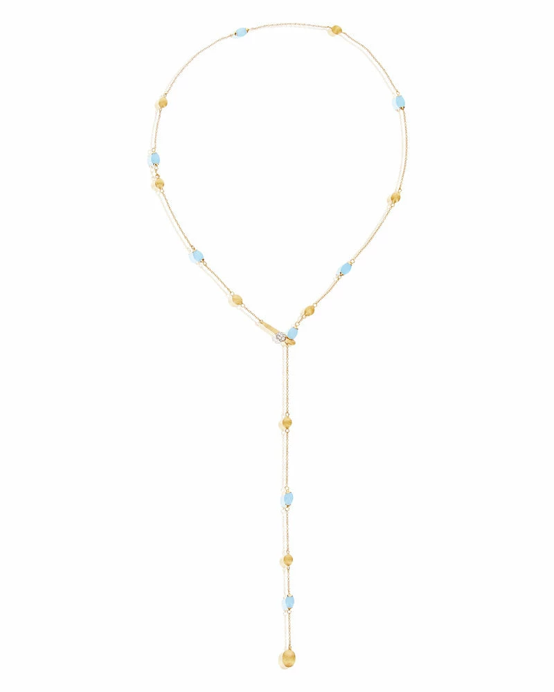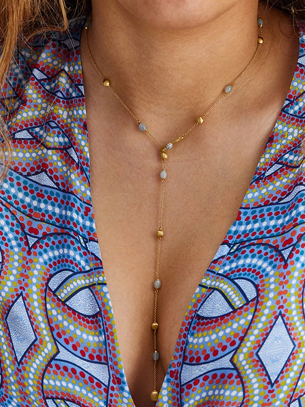 Boules in 18kt gold and milky aquamarine chase each other in this fresh, contemporary necklace characterized by our unmissable versatility. The hook closure crowned by a refined diamond detail, summa of aesthetics and functionality, opens and closes like a spring, allowing you to adjust and interpret the necklace in the most varied ways. You can choose between a smooth, more classic interpretation, linking the closure to one of the final boules, or a more transgressive one, opting for a more high-necked version. A versatile and light jewel, and capable of adapting to all your facets!