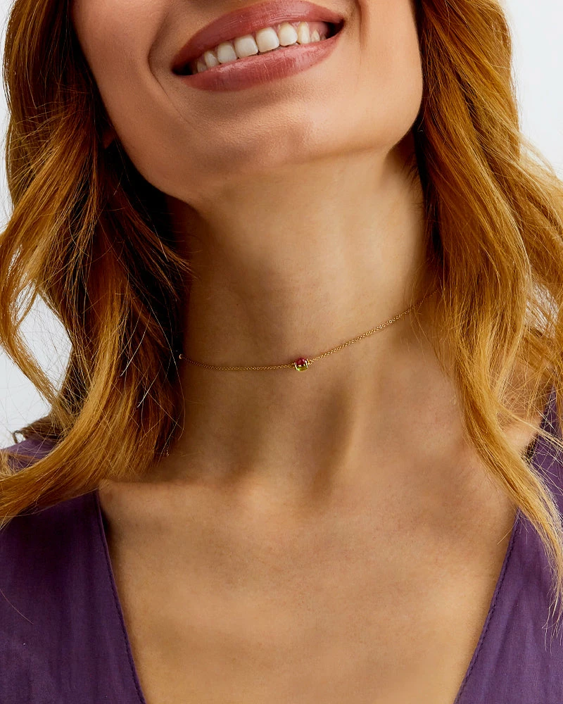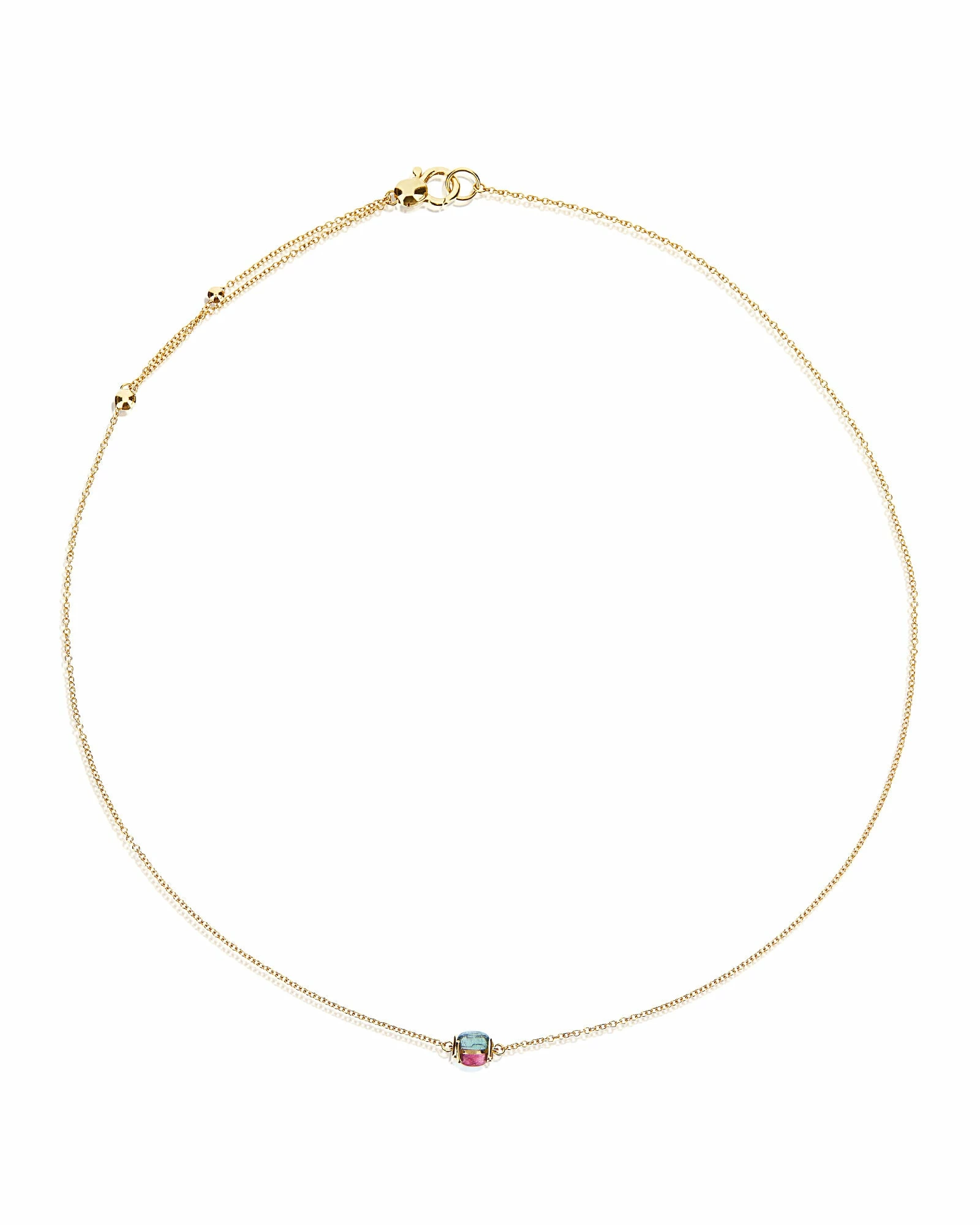 Lively and elegant at the same time, this 18kt gold necklace with double tourmaline cabochon is the perfect piece of jewelry to add a sophisticated touch to your look. To make it extremely versatile, the special chain in the closure that can be adjusted and which makes it possible to wear this jewel in a less high-necked way or as a choker, according to your taste.