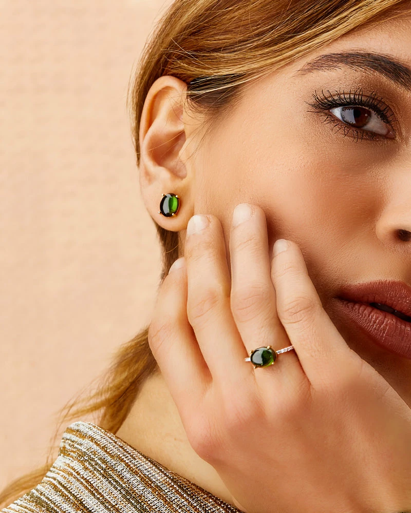 A fascinating tourmaline boule embraced by 18kt gold distinguishes these lobe earrings handcrafted by our artisans. Immerse yourself in the intense green and in the streaks that make this stone one of the most fascinating that Nature offers us!