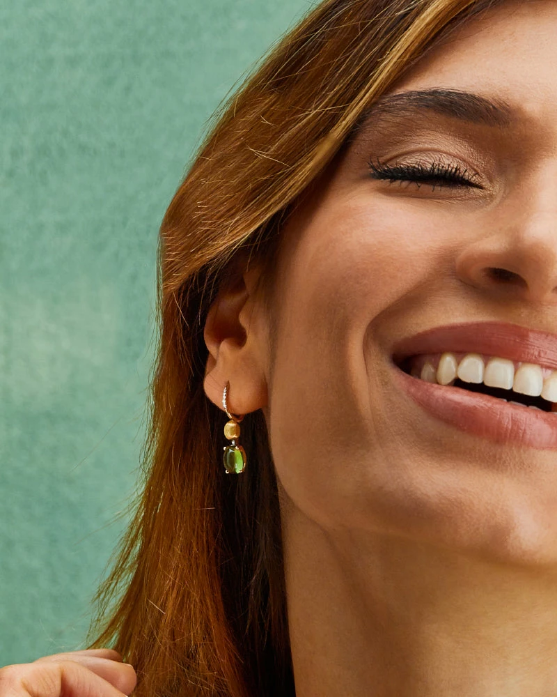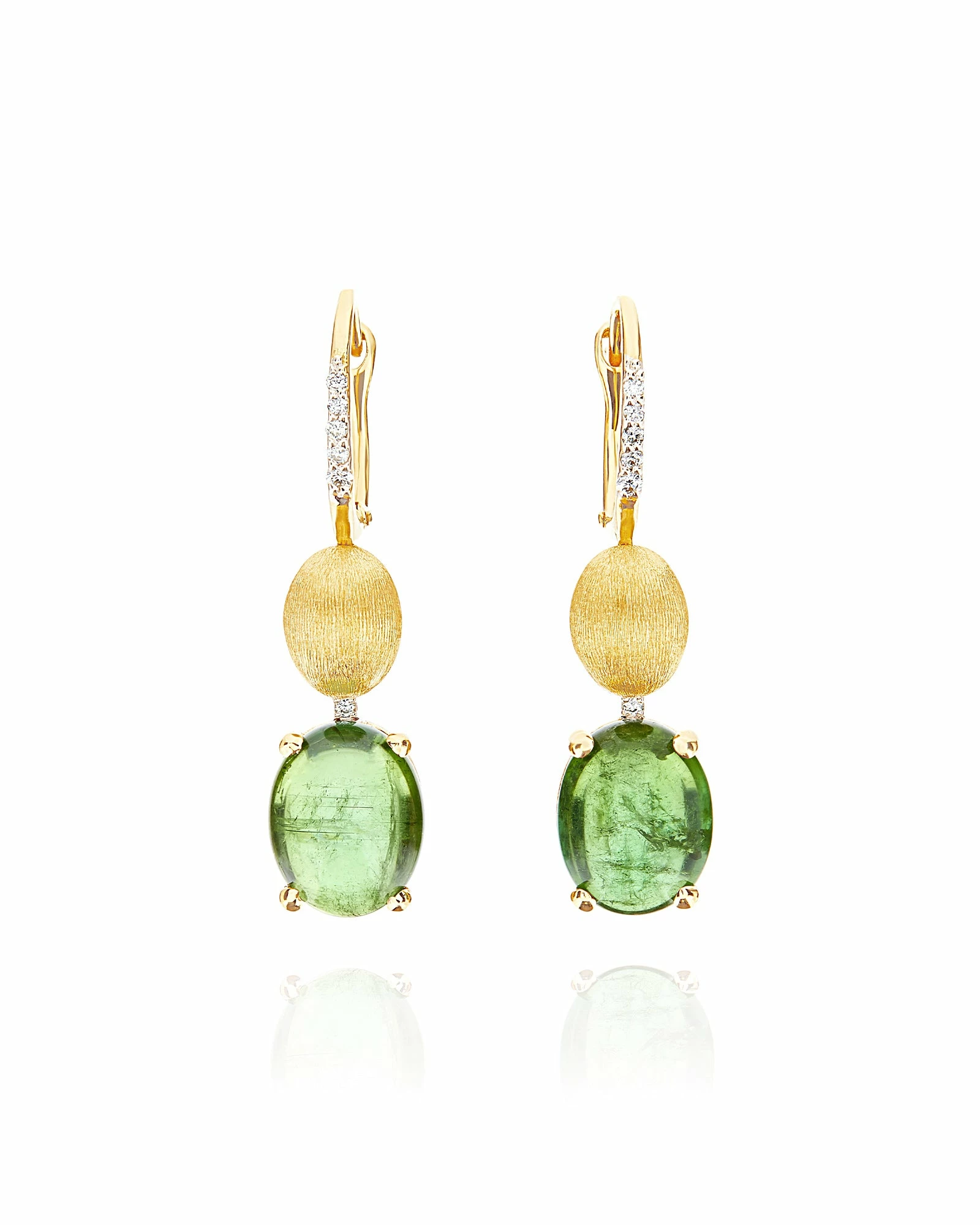 Refined 18kt gold earrings crowned with elegant diamond details and a green tourmaline boule. The grooves left by the burin play with the light, suggestively reflecting it, and sealing the encounter between Nature and craftsmanship.