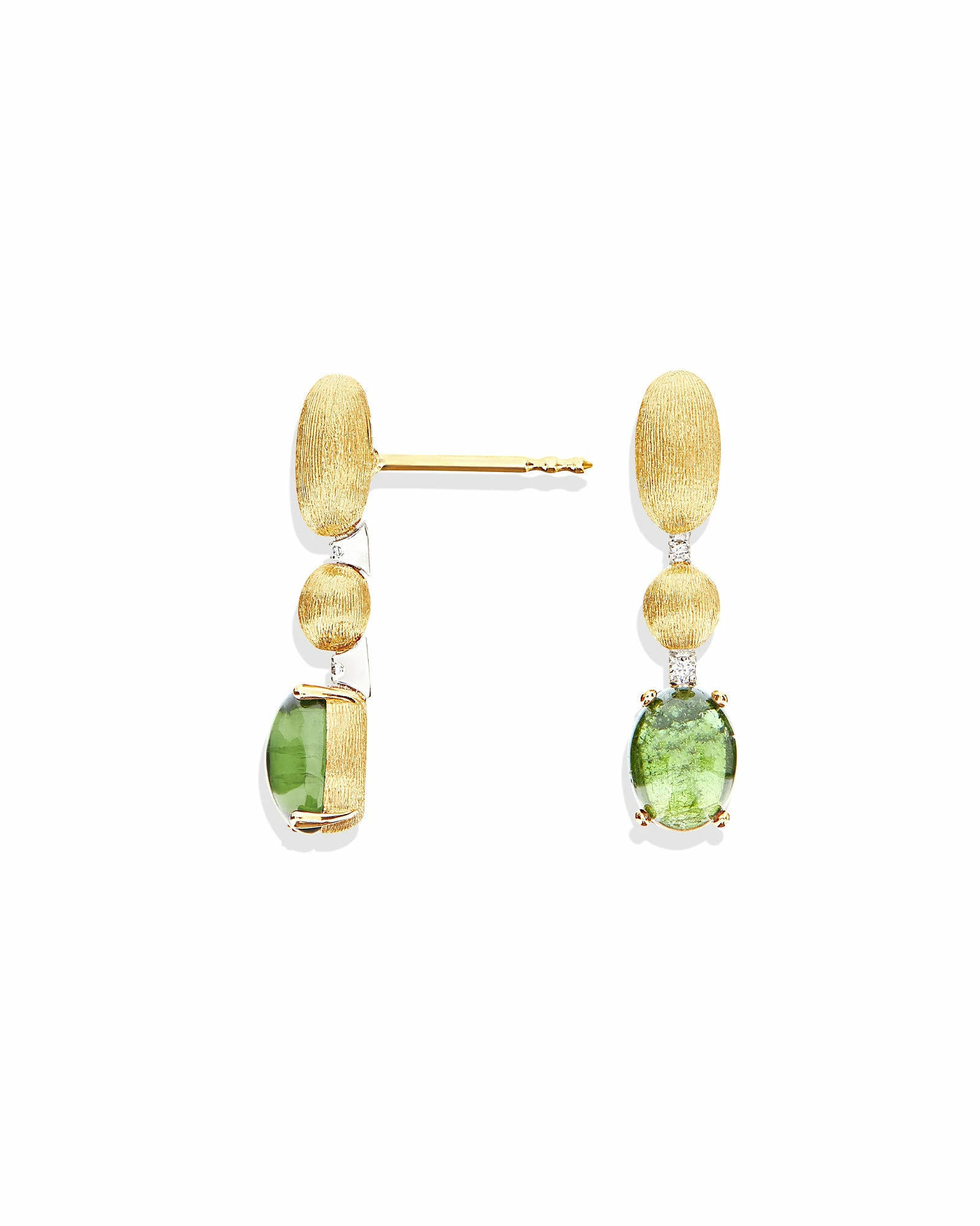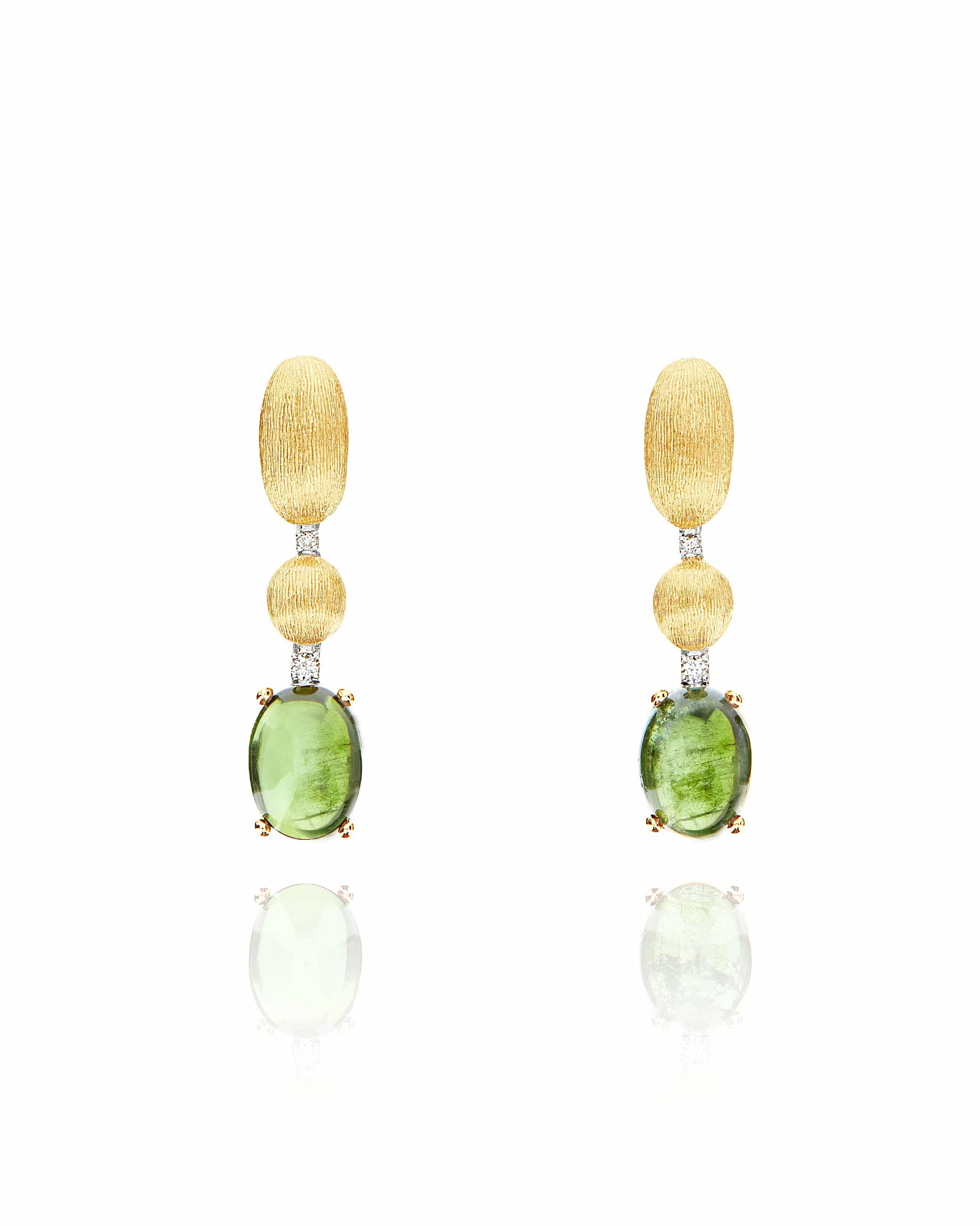 Two boules in 18kt gold, hand engraved with the ancient burin technique, run one after the other along small rivières of diamonds until getting lost among the extraordinary shades of the green tourmaline boule. A stone whose charm is beyond words, made unique by its irregular internal streaks, the signature of the greatest of artists: Nature. Laura, who tests each of her creations, has then created special butterflies for these earrings, equipped with a little plate to support the upper part of the earring, ensuring a perfect wearability.