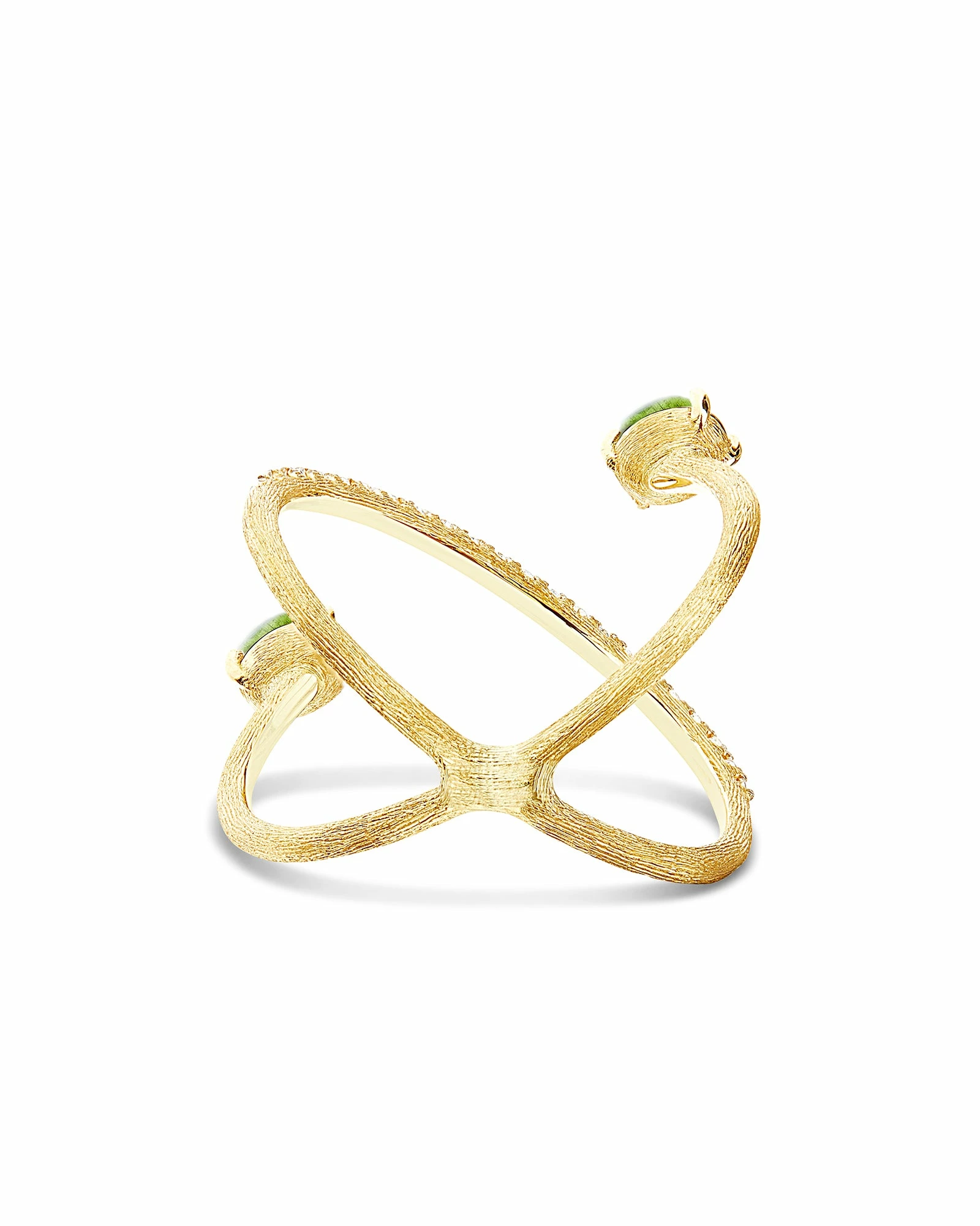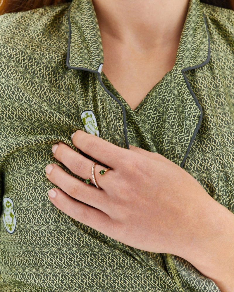 An unusual design meets, in this 18kt gold ring, two very colorful green tourmaline boules and a refined diamond rivières, in a play of light and reflections of poetic delicacy.