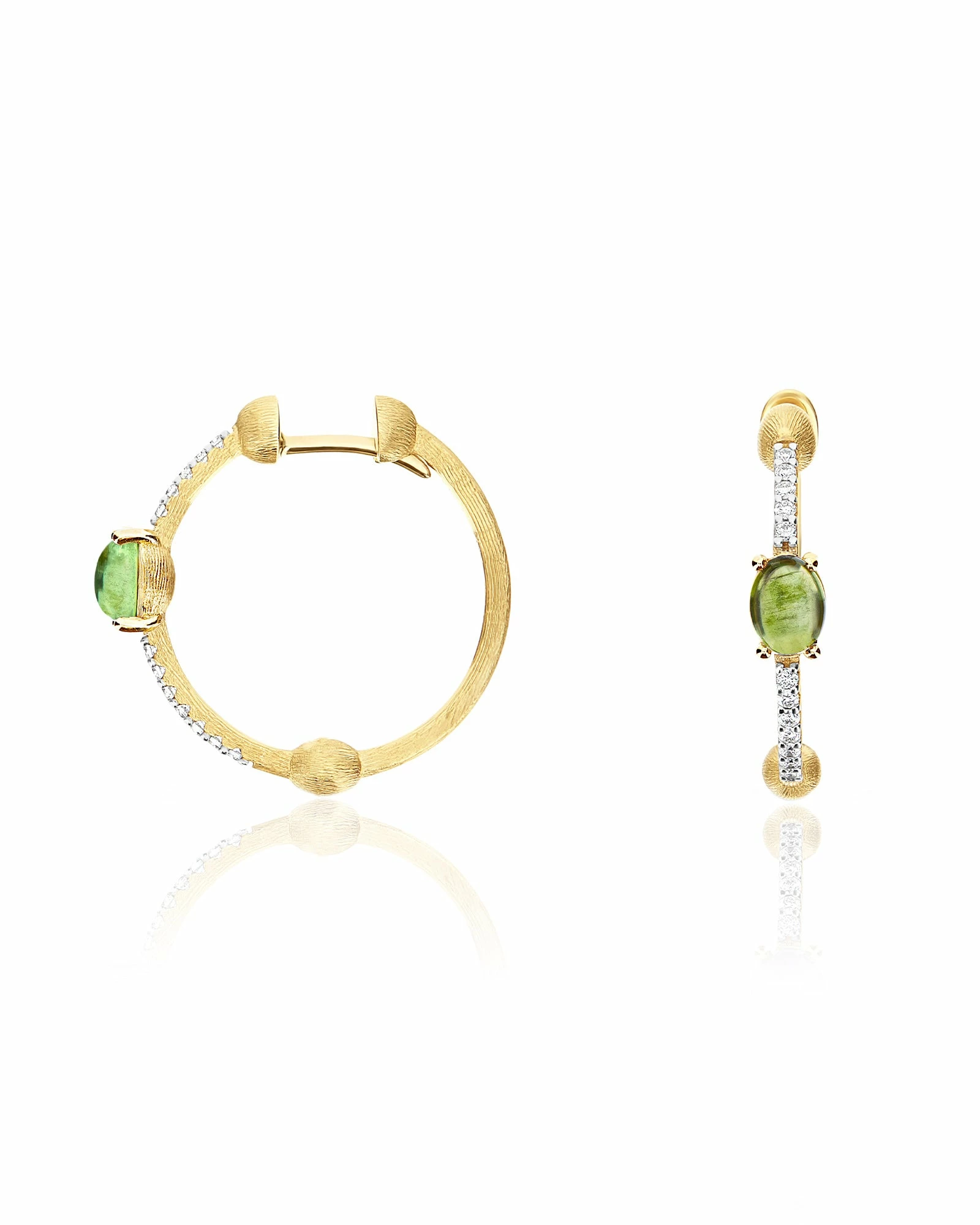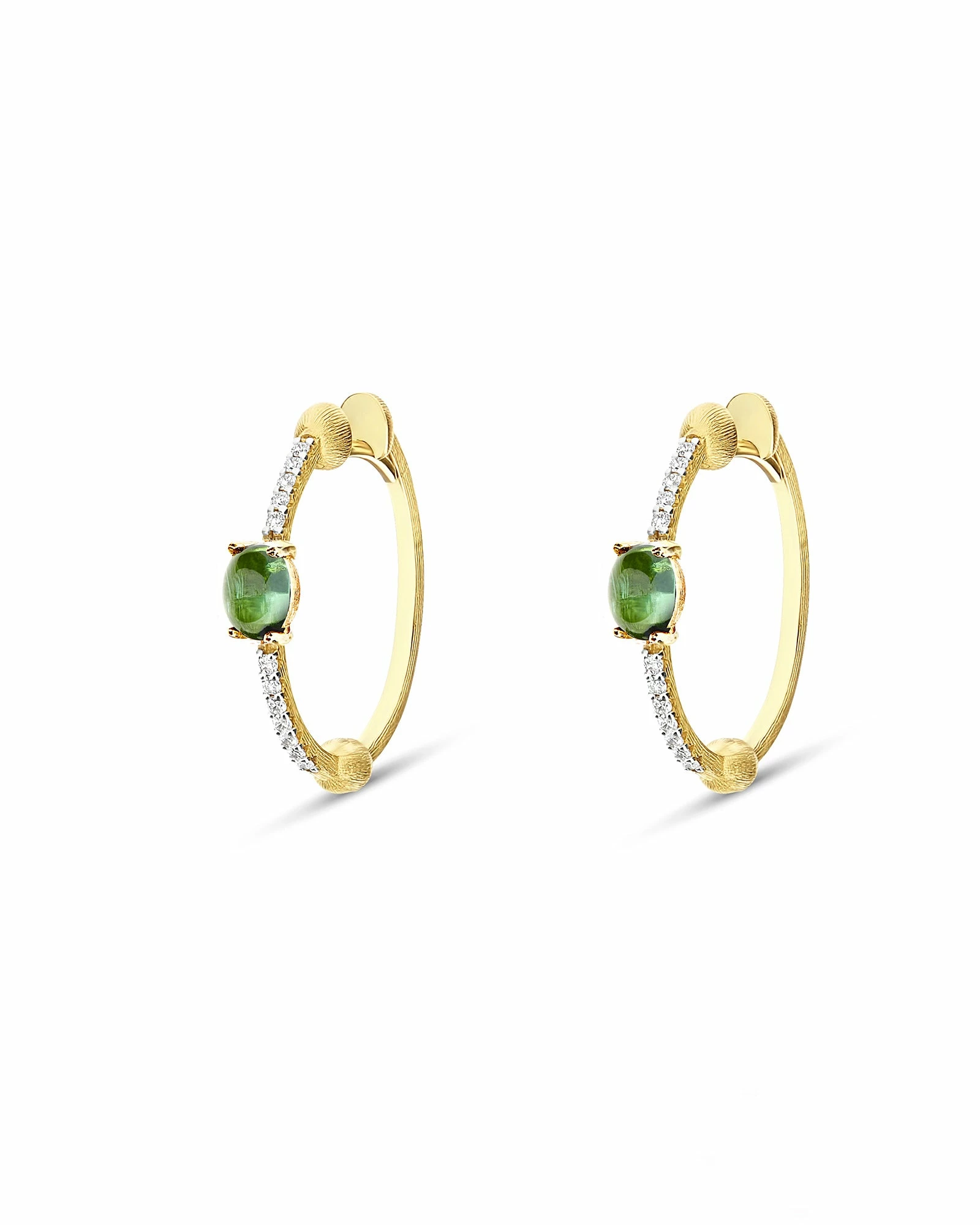 A fascinating green tourmaline boule, one of the most beautiful stones that Nature offers us, is embraced by riviรจres of diamonds that seem to chase each other in these 18kt gold hoop earrings. Laura’s advice? Wear these creoles alone or, if you have multiple holes on your ear, combine them with pink tourmaline (OS15-598), London Blue Topaz (OS35-597) or milky aquamarine (OS36-597) models, for a real pop touch to your look!
