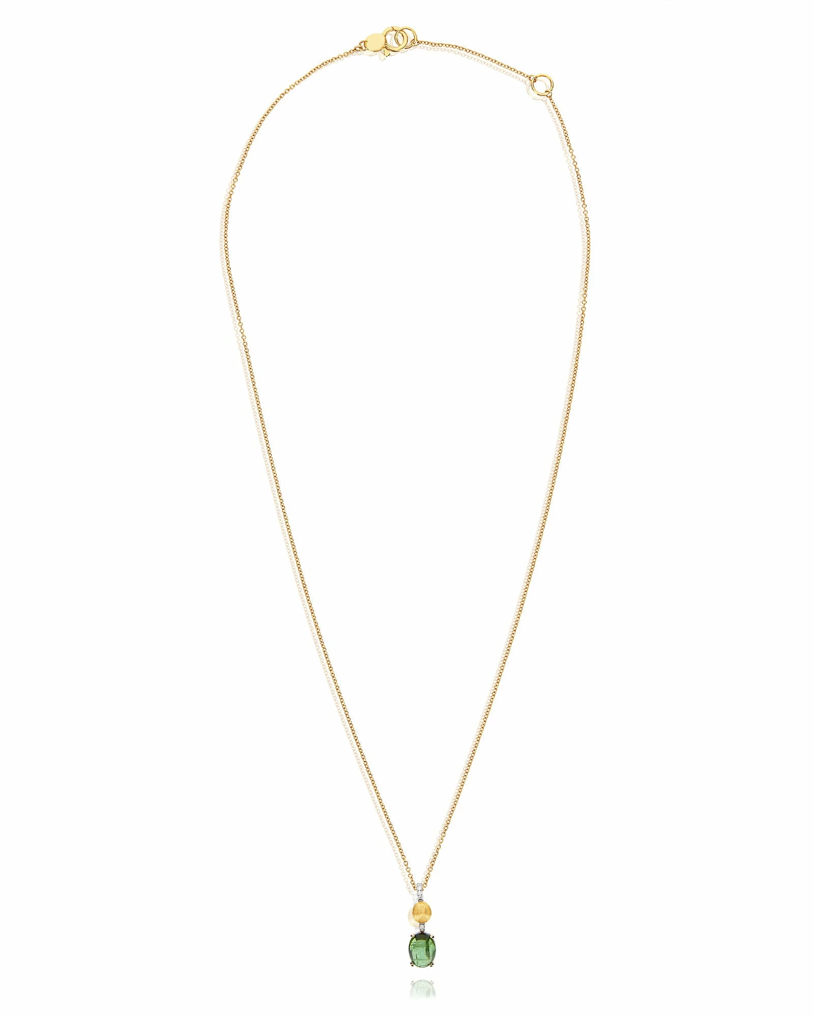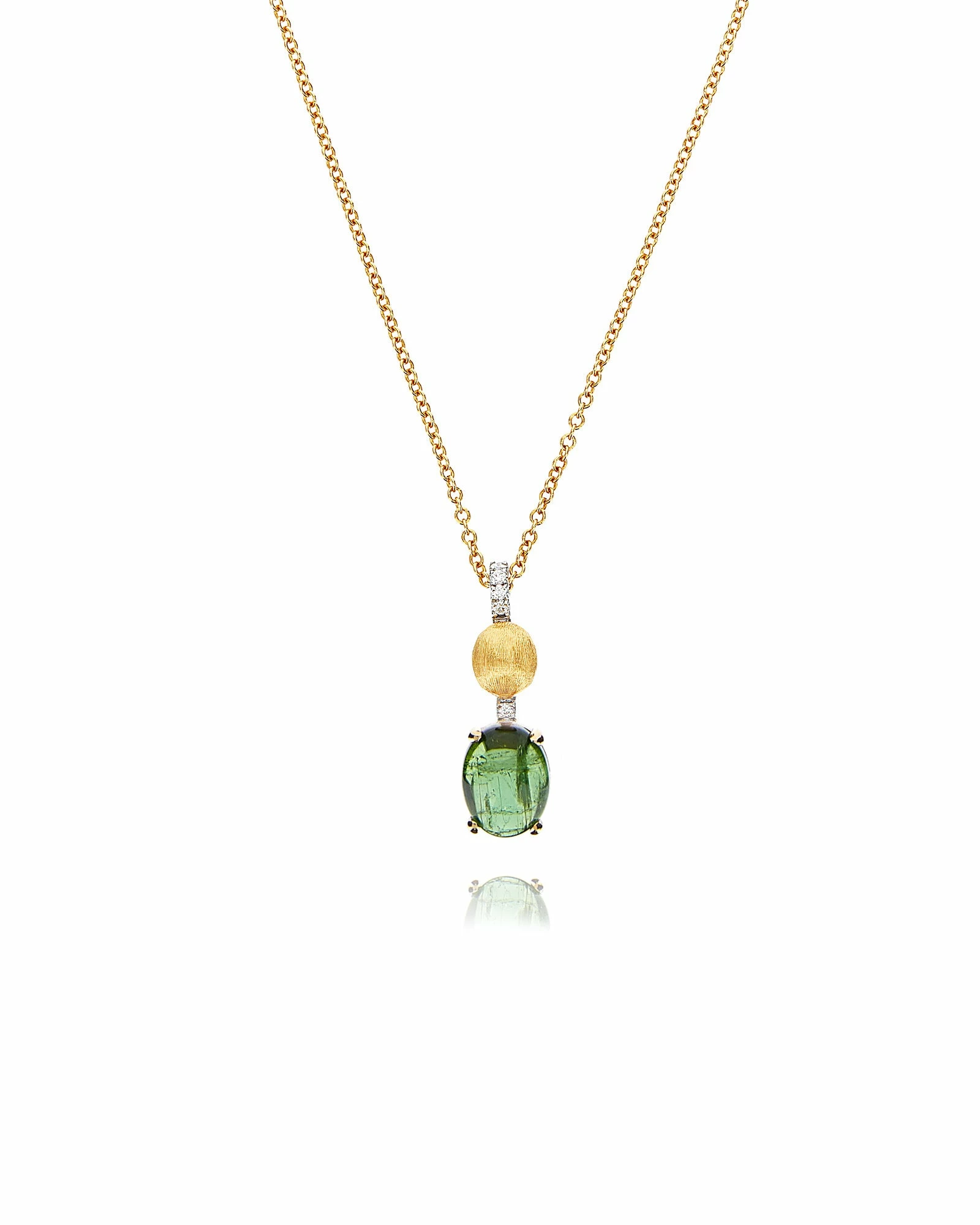 A lively and timeless elegance distinguishes this sophisticated pendant in 18kt gold and diamonds, crowned by a green tourmaline boule. This stone, which changes in intensity depending on the angle of observation, is one of the most extraordinary that Nature gives us and its peculiar inner streaks make each jewel unique and inimitable.
