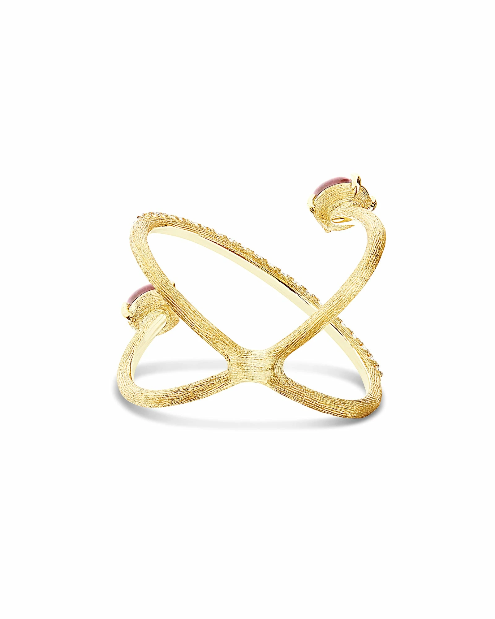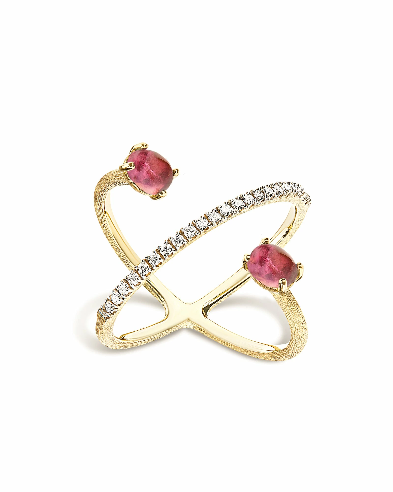 An 18kt gold ring with an unusual design. Two very colorful pink tourmaline boules, one of the most fascinating stones that Nature offers us, chase each other through a splendid rivière of diamonds, in a jewel that embraces the finger with lively elegance.