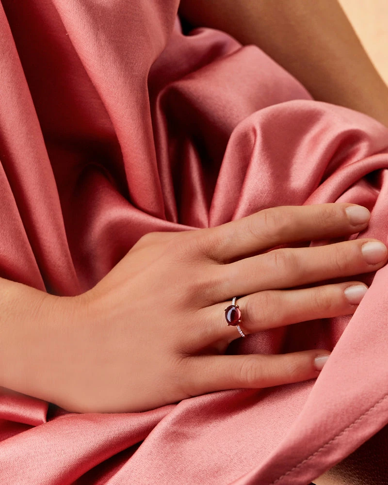 An amulet that embraces the finger in diamonds, 18kt yellow gold and pink tourmaline, a fascinating natural stone known for its incredible colors and inner streaks that make it absolutely unique. Laura’s advice? With the rings, exaggerate! Create your combination, but above all: have fun!