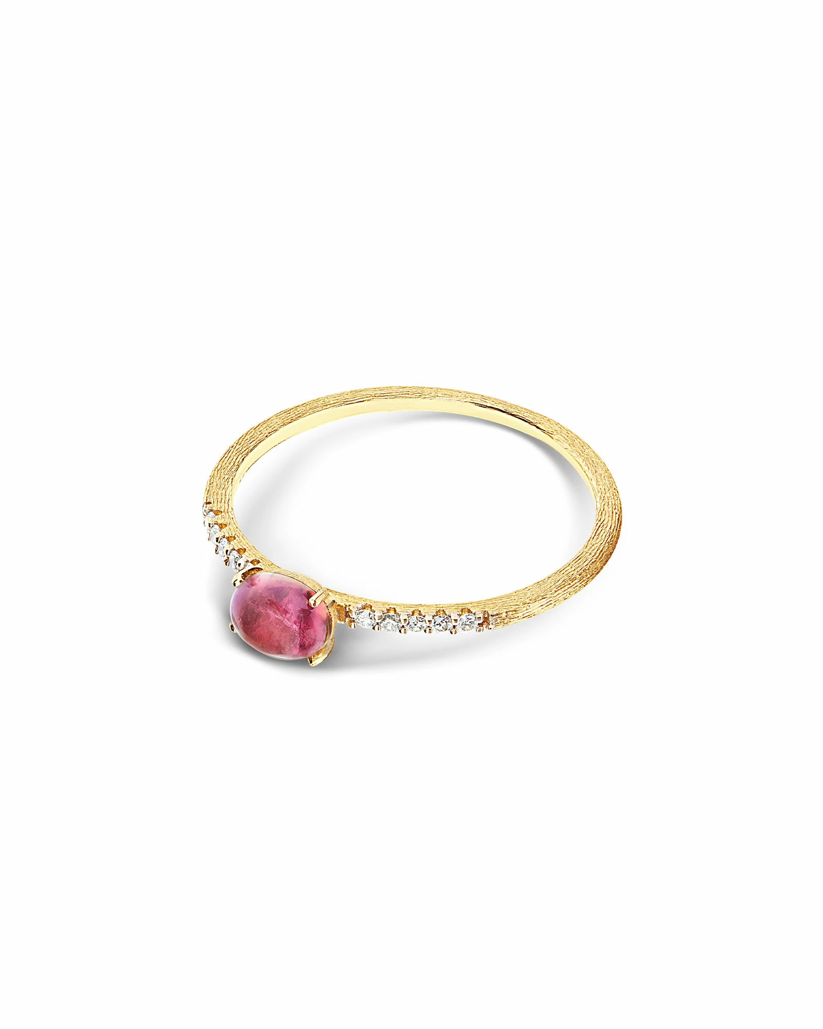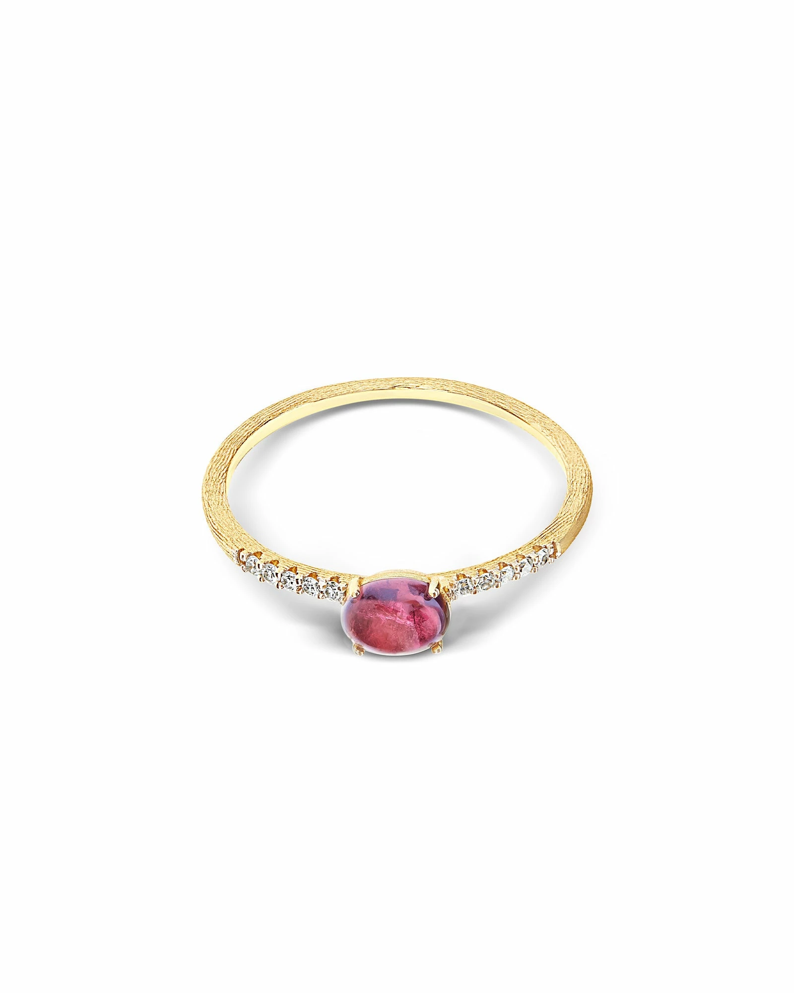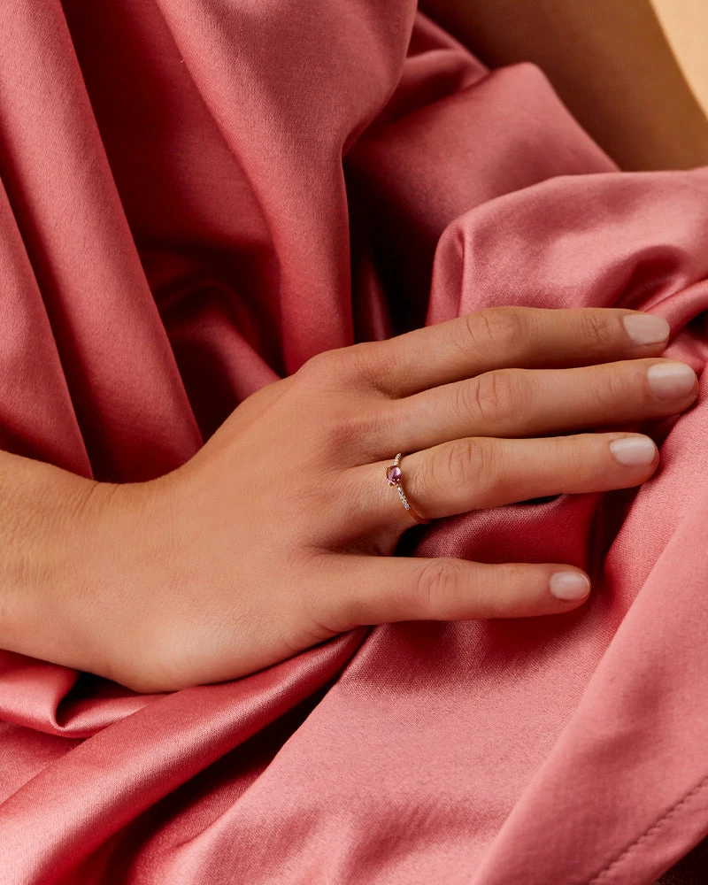 An amulet that embraces the finger in diamonds, 18kt yellow gold and pink tourmaline, a fascinating natural stone known for its incredible colors and inner streaks that make it absolutely unique. Laura’s advice? With the rings, exaggerate! Create your combination, but above all: have fun!