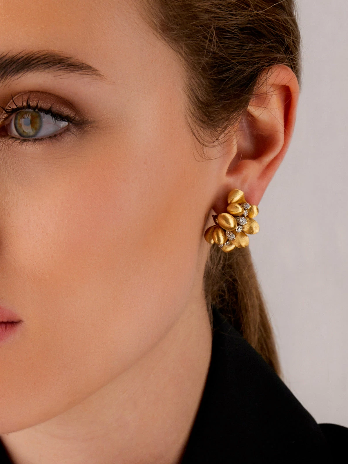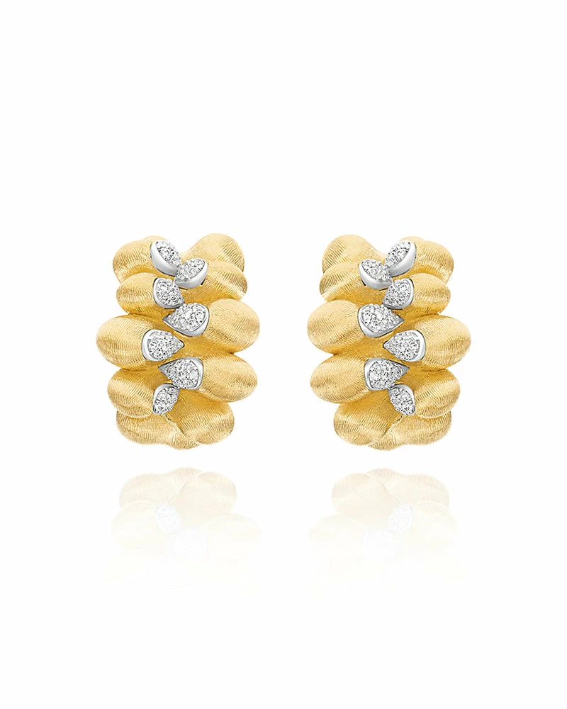 A neoclassical luxury distinguishes these iconic 18 kt gold earrings handcrafted and decorated with diamond pavé drops: works of art to wear.Laura, who tests each of her creations, has created special butterflies for these earrings, equipped with a little plate to support the upper part of the earring, ensuring a perfect wearability.