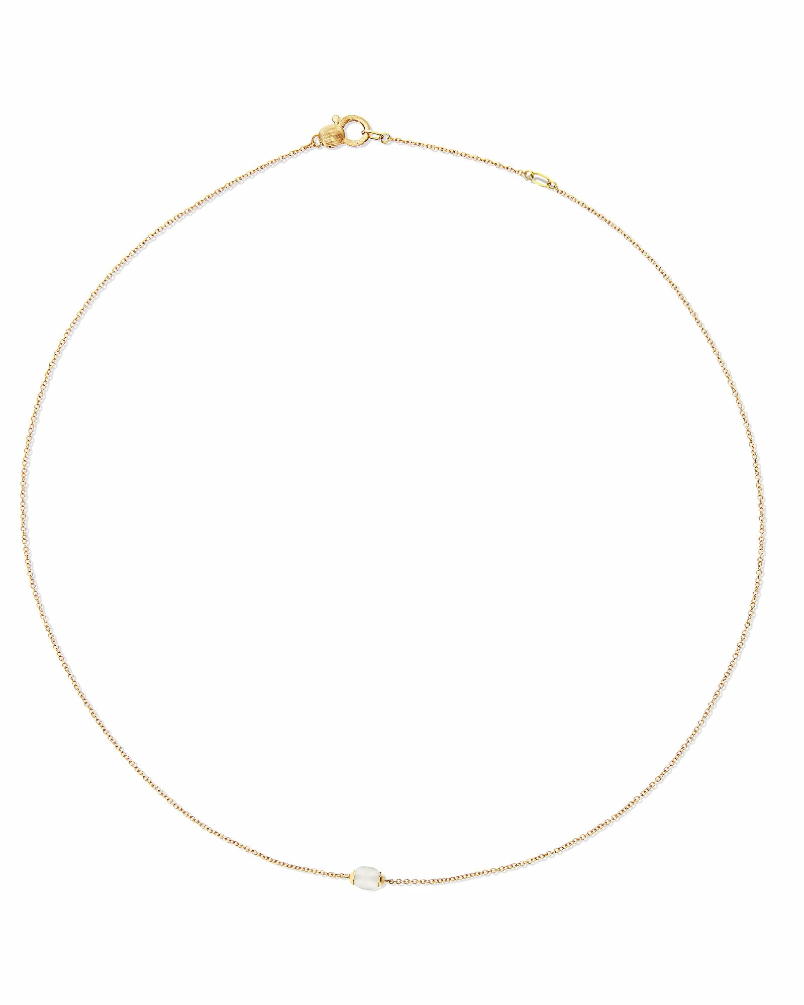 From our gypsy Terre Lontane collection, a delicate 18kt gold necklace decorated with a moonstone boule. The gold ring allows you to adjust the size of the jewel, making it more or less high-necked, according to you taste. The necklace can be worn alone or, for an extra touch of color, can be personalized with the magnificent pendants of the WHITE DESERT series (PS14-603, PS7-603, PS1-603), inspired by the extraordinary white sands of the desert of the New Mexico.