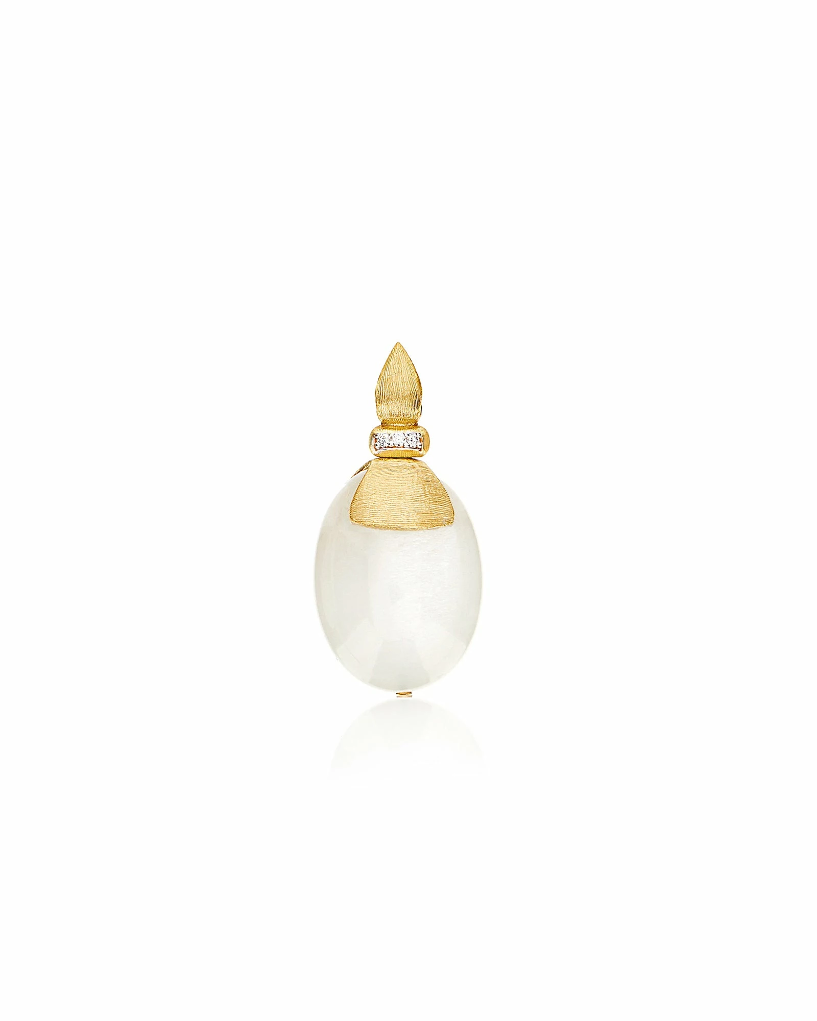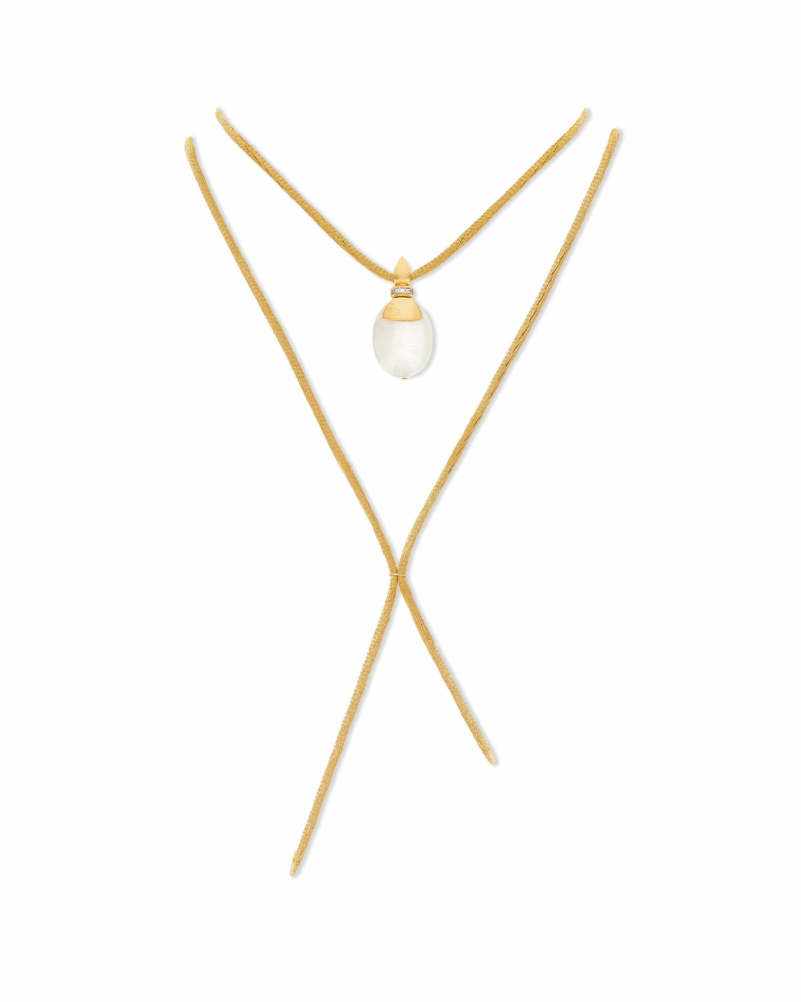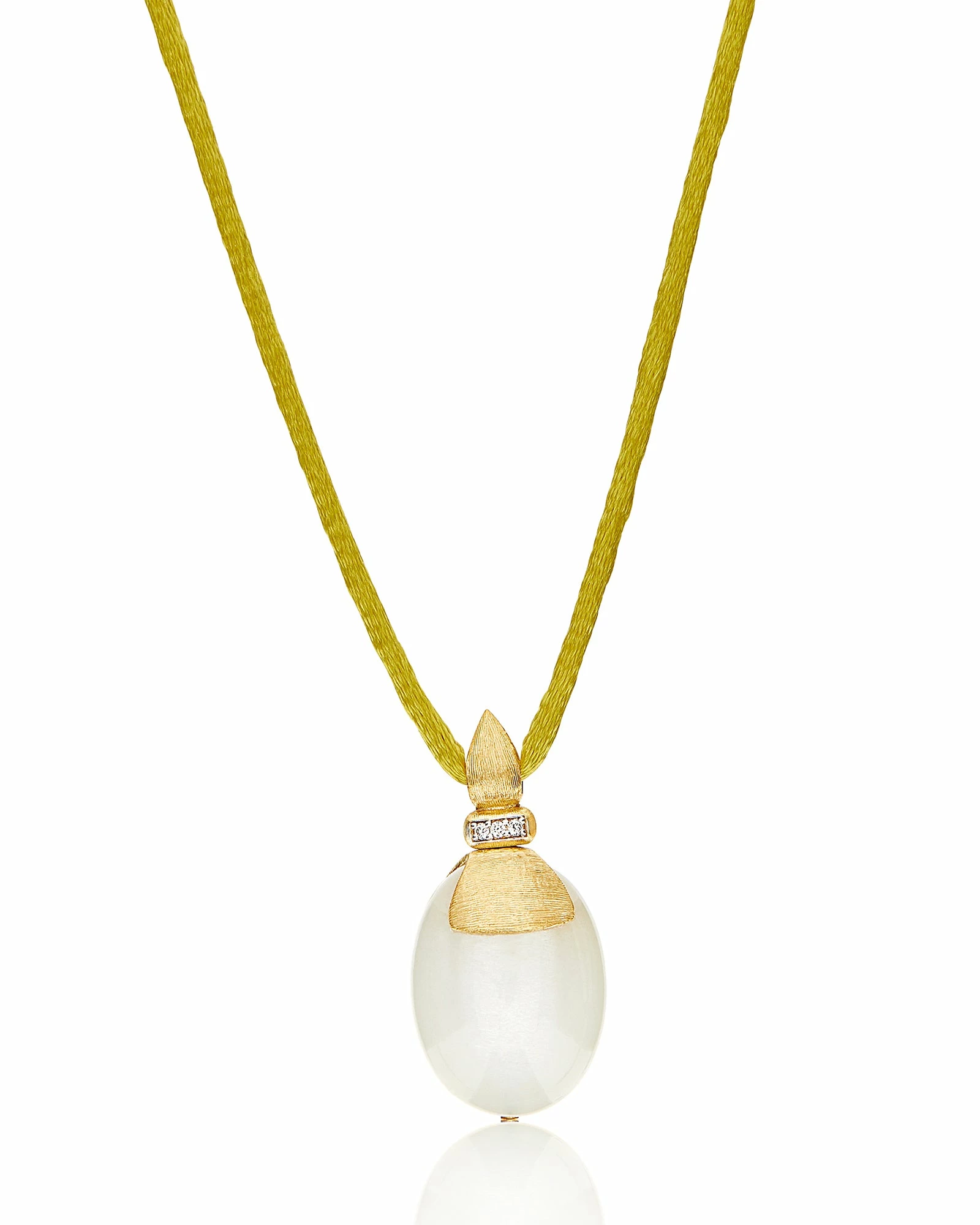 Refined pendant in moonstone, 18kt gold and diamonds. A necklace inspired by the White Sands of the New Mexico desert, an unconventional destination but extraordinary to say the least. Interpret this jewel as a bracelet or a necklace, transforming it into your faithful travel companion.